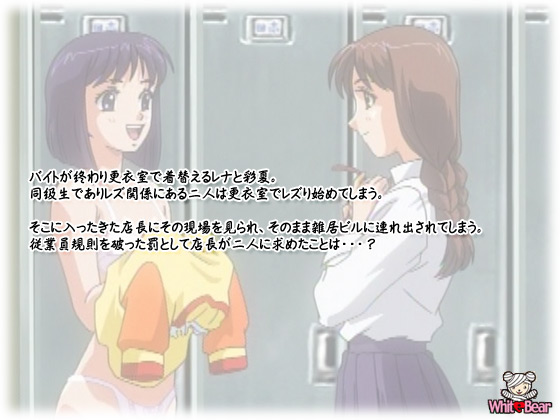 バイトが終わり更衣室で着替えるレナと彩夏。同級生でありレズ関係にある二人は更衣室でレズり始めてしまう。そこに入ったきた店長にその現場を見られ、そのまま雑居ビルに連れ出されてしまう。従業員規則を破った罰として店長が二人に求めたことは・・・?