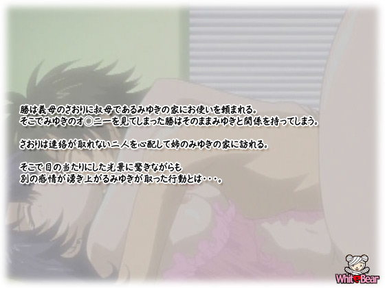 勝は義母のさおりに叔母であるみゆきの家にお使いを頼まれる。そこでみゆきのオナニーを見てしまった勝はそのままみゆきと関係を持ってしまう。さおりは連絡が取れない二人を心配して姉のみゆきの家に訪れる。そこで目の当たりにした光景に驚きながらも別の感情が湧き上がるみゆきが取った行動とは・・・。