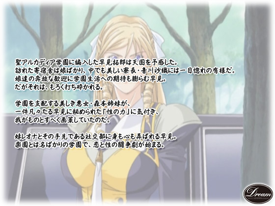 聖アルカディア学園に編入した早見拓郎は天国を予感した。訪れた寄宿舎は娘ばかり、中でも美しい寮長・音川沙織には一目惚れの有様だ。娘達の奔放な歓迎に学園生活への期待も膨らむ早見。だがそれは、もろく打ち砕かれる。学園を支配する美しき悪女・森本姉妹が、一件凡々たる早見に秘められた「性の力」に気付き、我がものとすべく画策していたのだ。妹レオナとその手先である社交部に身も心も弄ばれる早見。楽園とは名ばかりの学園で、恋と性の闘争劇が始まる。
