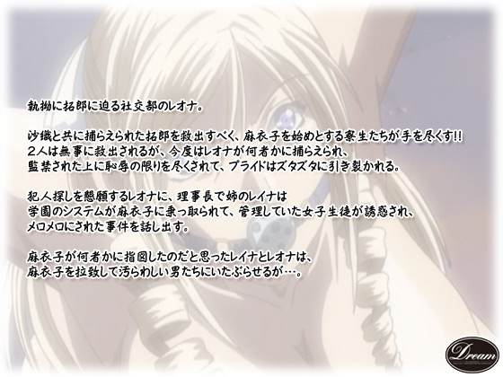 執拗に拓郎に迫る社交部のレオナ。沙織と共に捕らえられた拓郎を救出すべく、麻衣子を始めとする寮生たちが手を尽くす!!2人は無事に救出されるが、今度はレオナが何者かに捕らえられ、○○された上に○○の限りを尽くされて、プライドはズタズタに引き裂かれる。犯人探しを懇願するレオナに、理事長で姉のレイナは学園のシステムが麻衣子に乗っ取られて、管理していた女子生徒が誘惑され、メロメロにされた事件を話し出す。麻衣子が何者かにレオナを○○するよう指図したのだと思ったレイナとレオナは、麻衣子を拉致して汚らわしい男たちにいたぶらせるが…。