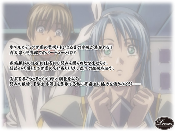 聖アルカディア学園の驚愕ともいえる裏の実態が暴かれる!!森本家・迎賓館でのパーティーとは!?家族親族の社会的経済的な弱みを握られた学生たちは、救済の代償として学園の奴○となり、数々の醜態を晒す。真実を暴こうとまどかが潜入調査を試み、弱みの根源、「学生名簿」を奪取する為に寄宿生に協力を請うのだが…