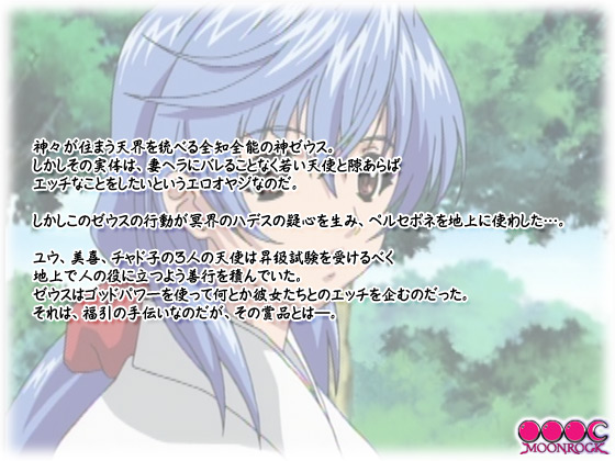 ユウ、美喜、チャド子の3人の天使は昇級試験を受けるべく地上で人の役に立つよう善行を積んでいた。ゼウスはゴッドパワーを使って何とか彼女たちとのエッチを企むのだった。それは、福引の手伝いなのだが、その賞品とは―。