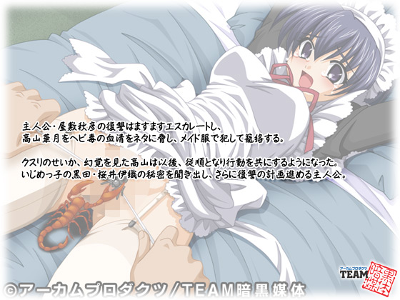 主人公・屋敷秋彦の復讐はますますエスカレートし、高山華月をヘビ毒の血清をネタに脅し、メイド服で○して肉奴○を誓わせる。
