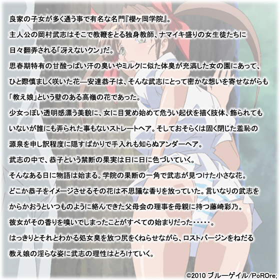 思春期特有の甘酸っぱい汗の臭いやミルクに似た体臭が充満した女の園にあって、ひと際慎ましく咲いた花―安達恭子は、そんな武志にとって密かな想いを寄せながらも「教え娘」という壁のある高嶺の花であった。