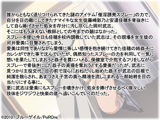 誰からともなく送りつけられてきた謎のアイテム「○淫誘発スプレー」の力で、自分を目の敵にしてきたナマイキな女生徒藤崎彩乃と安達佳穂を骨抜きにして自ら捧げさせた処女を存分に汚し尽くした岡村武志。そこにはもう冴えない教師としての今までの顔はなかった。