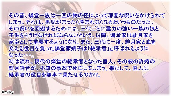 その呪いを回避するためには、三代ごとに霊力の強い一族の娘と○○をもうけなければならないという。以降、燐堂家は緋月家を家臣として重要するようになり、また、三代に一度、緋月家と血を交える役目を負った燐堂家嫡子は「継承者」と呼ばれるようになった・・・。