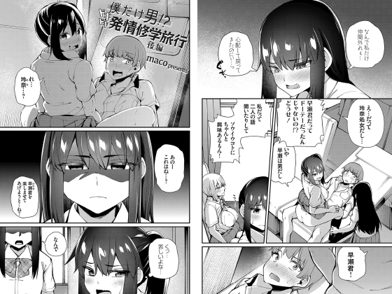 四人一組で組むことになった修学旅行の班。しかし、主人公の早瀬(はやせ)はいつの間にか一人取り残されてしまった。そこに声をかけてきたのは女子三人。ウリをやっていると噂の神崎葵(かんざき あおい)。バスケ部員の大半とヤってると噂の桜井美久(さくらい みく)。そして、そんな二人となぜか仲のいい橘玲奈(たちばな れな)。女子三人に男子一人だけの班というだけで気まずいのに、さらに女子たちのキャラが濃すぎてすでに不安いっぱいの早瀬だった。班行動の最中、体調不良を理由に桜井さん神崎さんと三人で早瀬はバスに戻ってきていた。もちろん、エッチをするために!しかし、処女なことを理由に避けたはずの橘さんが心配してバスに戻ってきた為に、挿入直前にバレてしまう。処女だけど、ちゃんと「そういうこと」に興味あると言い張るため、一旦お預けでまさかの橘さんのターン!?まさかこんなことになるなんて…予想外の展開だらけの修学旅行は更にヒートアップする!!