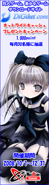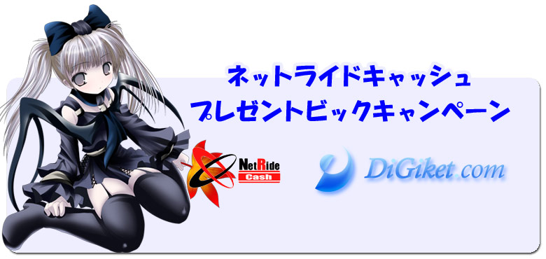 2008年10月1日〜2008年12月31日の間に、DiGiket.comで作品をご購入されましたお客様から抽選で毎月30名様に1000ポイントのNetRideCashをプレゼント!!!作品ご購入すると自動的に抽選対象となりますので楽々♪
