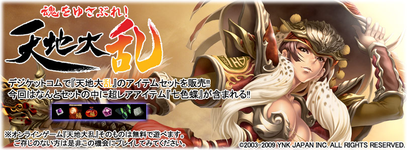 デジケット・コムとYNK JAPANの共同企画により、MMORPG「天地大乱」のアイテムセットのシリアルをデジケットで2009/8/14から販売開始!!
