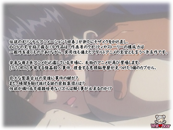 伝説のオリジナルアニメーション「回春」が新たにモザイクをかけ直し、60分の完全版で蘇る!!今作品は、作画等のクオリティやストーリーの構成力は一般作を凌ぐものでありながら、実用性も備えたアダルトアニメの至宝とも言うべき名作です。安易な萌え系アニメが氾濫している市場に、本物のアニメが再び登場します。[STORY]多発する○○○人事件、捜査する恵頭脳警察が見つけた1個のカプセル。巨大な製薬会社の背後に事件の鍵が?また、暗闇を駆け抜ける謎の密教集団とは?性欲が織り成す複雑怪奇なパズルは解く事が出来るのか!?
