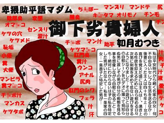 平安時代から続く名家一条家の四女香子(かおるこ)。実家の経済的理由で40歳も年上の名取重工の社主・名取有三の後妻に処女で結婚。やっと女の喜びを覚えた頃には旦那は65歳、すでに加齢で男の機能を失っていた。湧き上がる女の性欲を自慰で処理していた香子は、徐々に刺激を求めて危険な遊びを。そして香子が遊びを仕掛けた男が、あの絶倫巨根男の田所だった。その田所に正体を知られた名家の奥様香子…電話で脅され…田所の探偵事務所に連れ込まれる。そこで香子に加えられる辱めの数々。泣いて抵抗する上品なはずの名家の奥様が、、次第に田所の淫語責めに心の奥底をあばかれ、徐々にお下劣な卑猥語を叫び始める。そして田所の淫乱責めにタガが外れたお上品奥様の美しい口唇から発せられる淫語の嵐、そして自ら陰部を拡張し交尾を願うその姿の下劣なこと卑猥なこと。清楚と淫乱。つつましやかとお下劣。超卑猥炸裂のむつき漫画。総天然色138P。まさに驚天動地のお下劣貴婦人。乞う御購入。