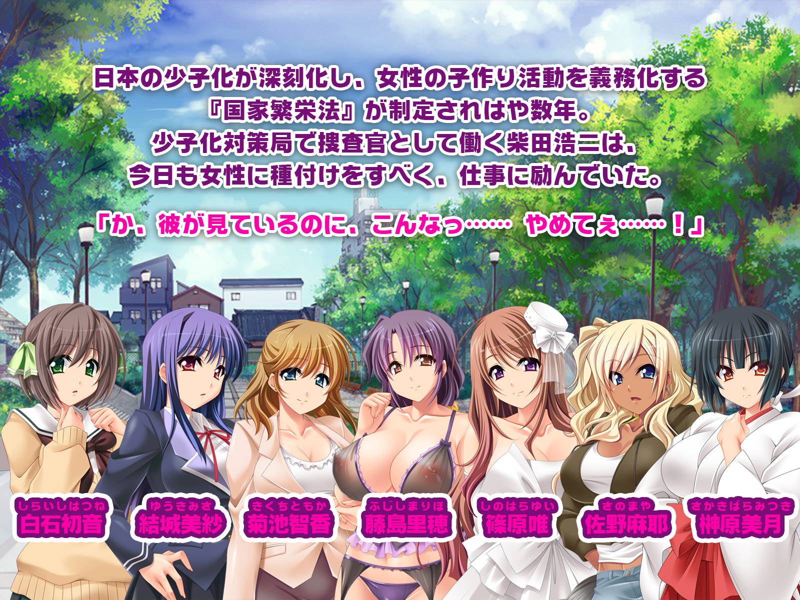 あなたは少子化対策局の上席捜査官となり部下を率いて、まだ妊娠していないいい女を探し出し、お国のためと女性に性と妊娠の悦びを教えるべくテクとチ○ポと精子の限り励むのだった!