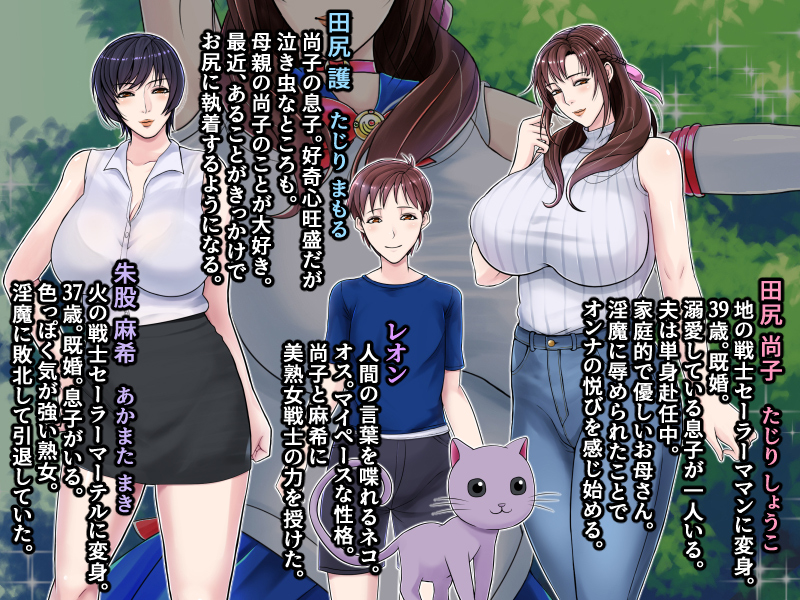 ・田尻尚子(たじり しょうこ):地の戦士セーラーママンに変身。39歳。既婚。溺愛している息子が一人いる。夫は単身赴任中。家庭的で優しいお母さん。淫魔に辱められたことでオンナの悦びを感じ始める。