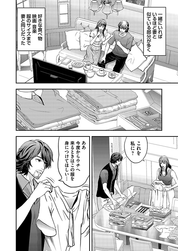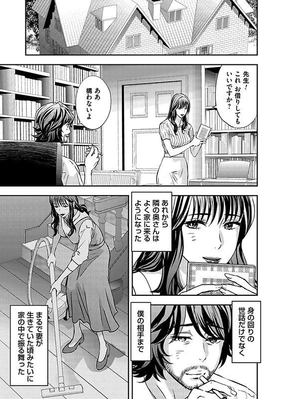 そんなある日、隣家に妻と瓜二つの女性・美幸とその夫が引っ越してくる。顔だけでなく、声や体つきまでもよく似た彼女が頭から離れない夏川。ふと窓の外を見ると、向かいの家の窓から美幸が夫ではない相手とセックスをしているところを目撃してしまう。もしかして…不倫――!?