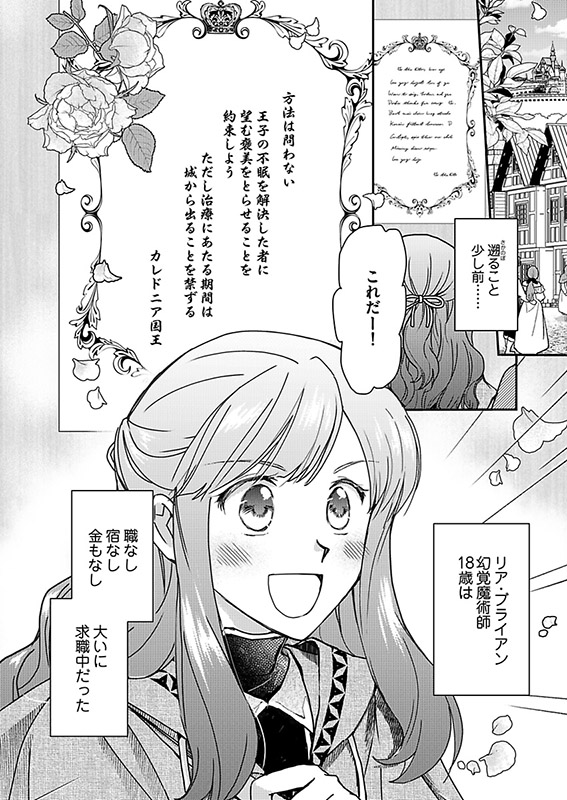 このお話は…三食宿付きと大変美味しい仕事に飛びつき、持ち前の幻覚魔術を用いて王子を懐柔しながら不眠治療係のお仕事の日々を描いたリアの素敵な奮闘記である!