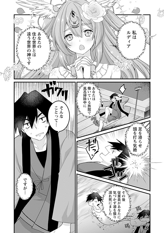 チートスキルを授かり、現代から異世界へと転生した元旅館従業員の遠野ジン。転生して束の間、モンスターと遭遇したジンはスキルで抵抗を試みるが、ただただ手からお湯が出るだけ!?