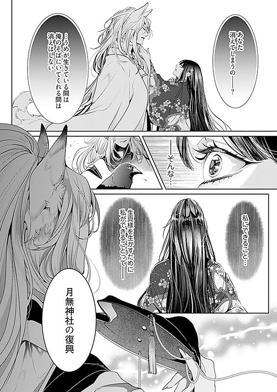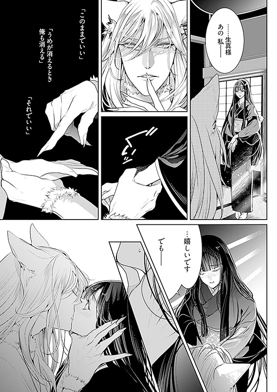 子に恵まれず嫁いだ家から捨てられた「うめ」。生まれた村に出戻るも、育ての両親が流行り病で亡くなり、天涯孤独の身に…。村では最近不作が続き、山神に「生贄」を捧げる話になっているという。生娘ではないが、子がいないうめは「処女(おとめ)」のままだと嘘をつき生贄に立候補する。山奥の社で待っていたのは、 白銀の美しい髪 、五色に光る美しい爪をもった狼神(おおかみ)様だった――。