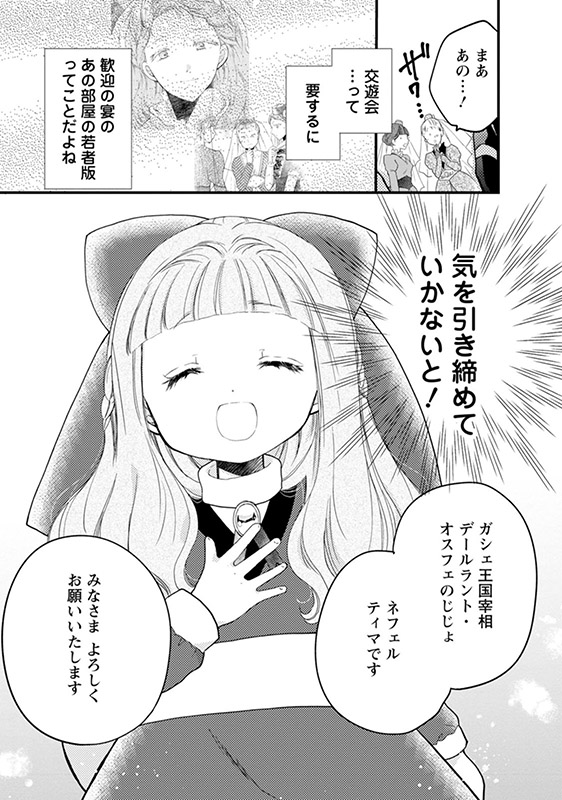 ライナス帝国独自の文化で、皇族のご友人たちが集まる「交遊会」に第三皇子のアイセント殿下から誘われてしまったネマ。「切れ者と有名なガシェ王国宰相閣下の娘」として強い注目を浴びてしまったよ…。パパンって他国にまで評判が届いているんですね。なんだか緊張しちゃうよーっ!殿下もなんだか食えない感じだしーっ…!