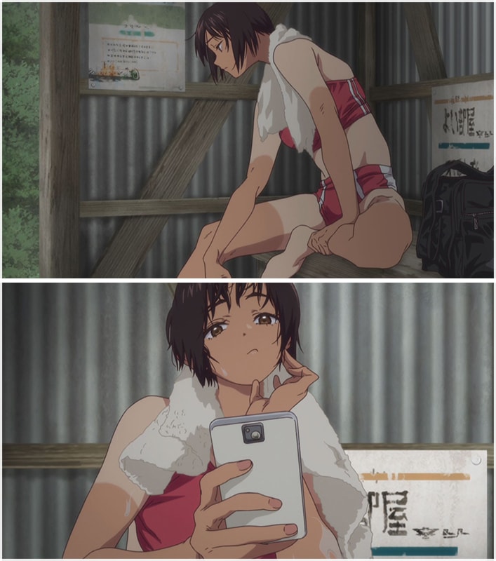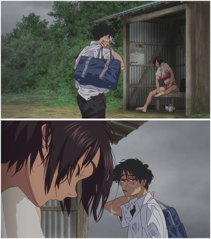 雨が降り頻る人里離れたバス停小屋で一人バスを待つ陸上女子。