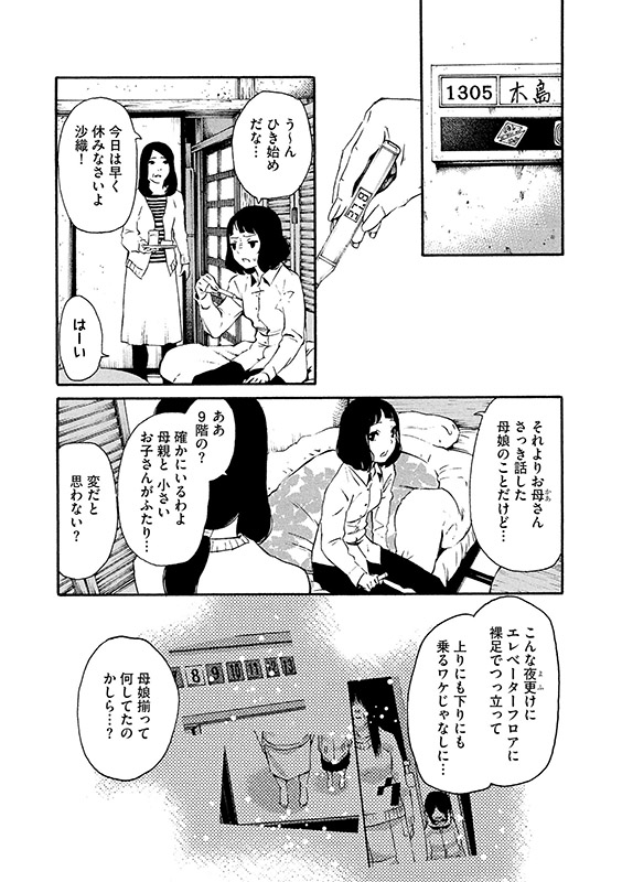 仕事から帰るある日、唯一稼働していた団地のエレベーターに乗り込むと、エレベーターに乗るでもなく、ただ突っ立っているだけの不思議な母娘を見かける。