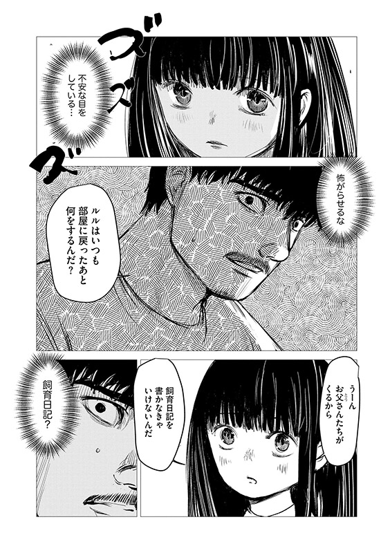 見知らぬ少女・ルルが彼を起こしにきて、男を「お兄ちゃん」と呼ぶ。