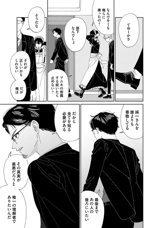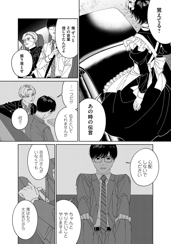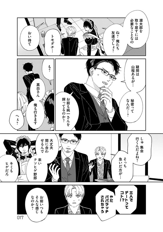 ヤクザの組に囲われた凛太郎を救うため、ヒゲメイド・百合川は単身で乗り込み、「一緒に帰ろう」と手を差し出す。しかしその手は凛太郎自身に振り払われてしまう。組長・純一の執着が、孤独を抱えた凛太郎の心を蝕み、縛りつけているのだ。──愛と孤独、血の絆。現代社会で問い直される「つながり」に、彼らが導き出した答えとは。ヒゲメイドが彩るハートフルストーリー、堂々完結!!