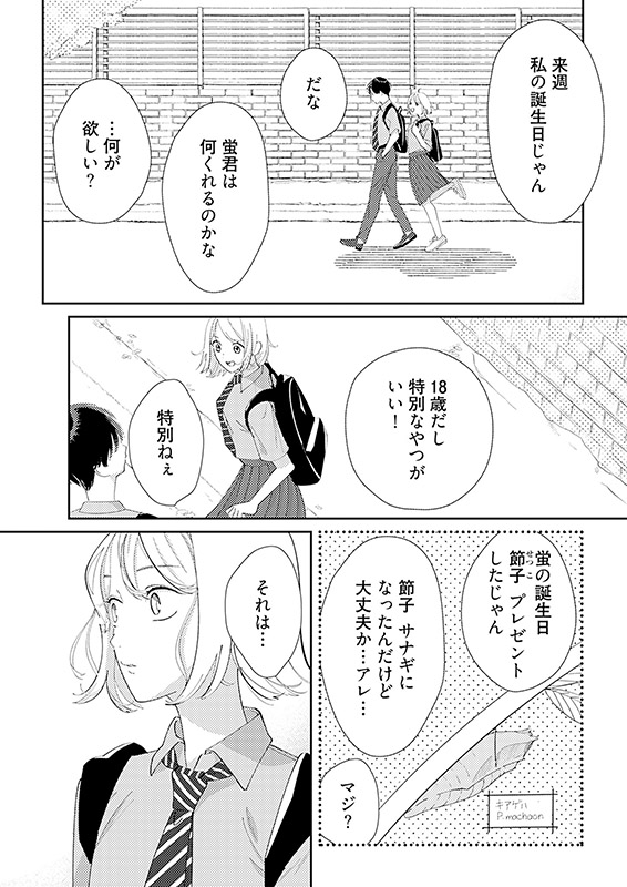ちょっぴり世間ずれした少女・花純(かすみ)のことを○○の頃からずっとそばで見守ってきた蛍(けい)。高校3年、花純の18歳の誕生日、花純のあるカン違いから2人はラブホテルへ…!? 花純への想いが溢れ出てしまう蛍、それを受け止められない花純。それ以来、2人は口をきかなくなってしまう。そして2年後、地元を離れ大学生になった2人は再会──花純のことを気に入っているゼミの先輩や何やら蛍とわけありなイマドキ女子も登場して、ずっと友達だった2人の関係は思わぬ方向に…!?