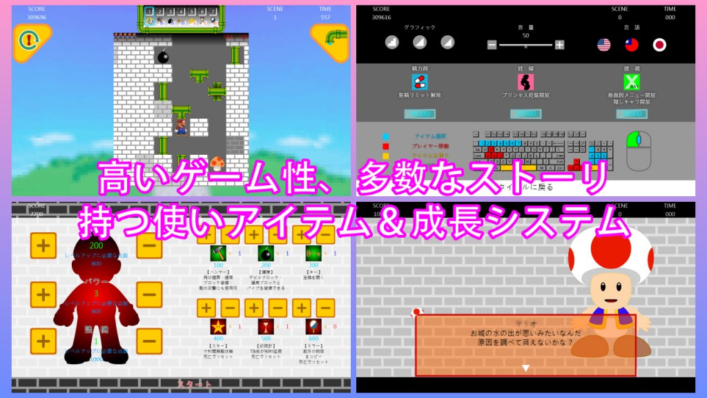 スコア点数を使って強くなりアイテムを買ってクリアを目指すのだ!