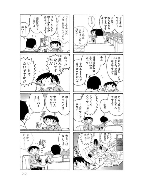 小心者な漫画家の「僕」と美人だけど短気な「妻」の、ゆる〜い日々の出来事をつらつらと描くエッセイ風4コマ。日常で当たり前にあるような小さな出来事に、一喜一憂して悩み葛藤する主人公(=作者)の姿がすごく共感できて、笑えます。