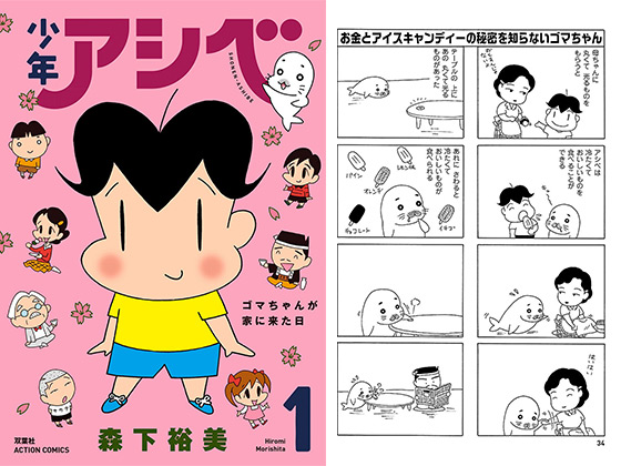 声がでかくて元気な少年、アシベ君はある日、トラックから落ちてきた白い生きものを拾う。それはゴマフアザラシの赤ちゃんだった。「ゴマちゃん」と名づけ、アシベの家族の一員となる。大工の父ちゃん、クールな母ちゃん、転校してしまったアシベが恋しいスガオ君…。さまざまなキャラが魅力を発揮する森下裕美の代表作。
