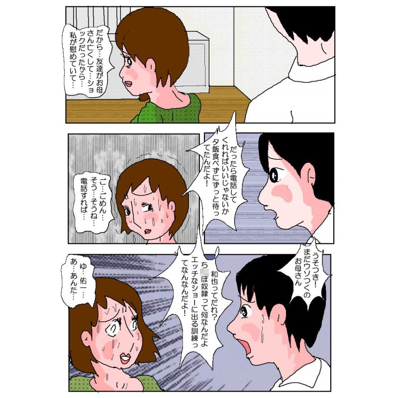 ユミがテレクラで知り合った若い男和也は、ひっかけた女とのセックスをビデオ撮影してはネットで販売して生活している不良少年だった。彼の肉簿の魅力に取り付かれた未亡人のユミに、和也は実演でのセックスショーへの出演を命令した。「いやなら絶交だ」の言葉に、泣くなく承諾したユミの電話を、なんと息子が盗み聞きしていた。和也の事でユミと口論となり、家を飛び出した息子の祐一に和也が近づく。「面白れえ物見せてやるぜ」と…。誘いに乗った祐一が目にしたものは、和也のチ○ポ○○と化して、泣きながら肉棒を懇願し、ザーメンとマン汁に塗れたお母さんの姿だった。お母さんの秘密の続編。背徳の変態漫画ここに完成。総天然色103P乞うご購入。