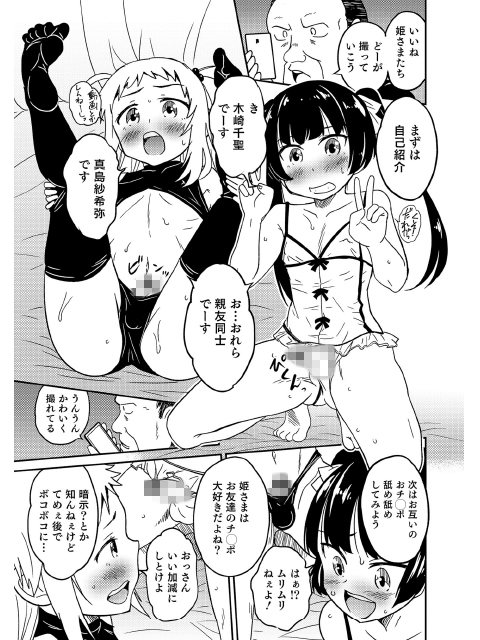 噂の黒Tシャツおじさんと動画を撮ろうとする千聖と紗希弥。ところが薬と暗示で逆におじさんに捕まってしまう。 エッチな格好をさせられおじさんの言うとおりにお互いのチ○ポを舐め合う二人v ※ オトコのコHEAVEN Vol.34 ○○×○○v男の娘PART2 収録作品