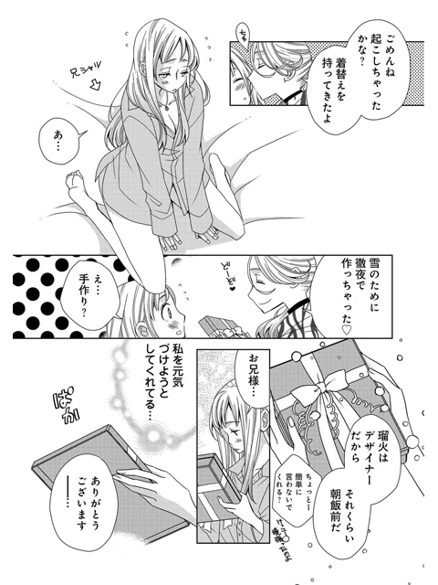 母の葬儀も滞りなく終わり、本当にこれで母とはお別れなんだと実感したら、とても悲しかった。 落ち込んでいる私に次兄の瑠火お兄様が洋服をプレゼントしてくれた。でも…この洋服はどう見ても下着……。乳首が見えてしまうデザインで恥ずかしい……。私のもともと持っていた洋服は…?