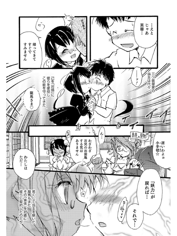 三ツ首塚龍馬はあやかしを使役して街を守る家に生まれた。 彼が使役する妖怪「鵺」三兄弟は、見た目は可愛い三姉妹の鵺たちvv 今日も龍馬は体液注入vで鵺たちを街を守るのだ!w ※ オトコのコ HEAVEN'S DOOR 9 収録作品