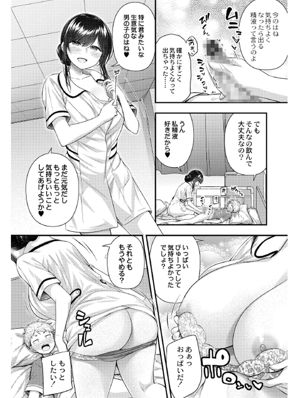 生意気男の子×巨乳ナース!生意気なでスケベな主人公はナースのお姉さんの巨乳が気になって仕方なかったのだが、ある日勃起に気づかれてしまい恥ずかしさからお姉さんを突き放してしまう。しかしその夜病室にお姉さんが忍び込んできて…