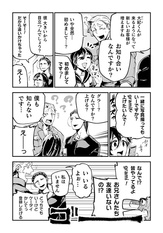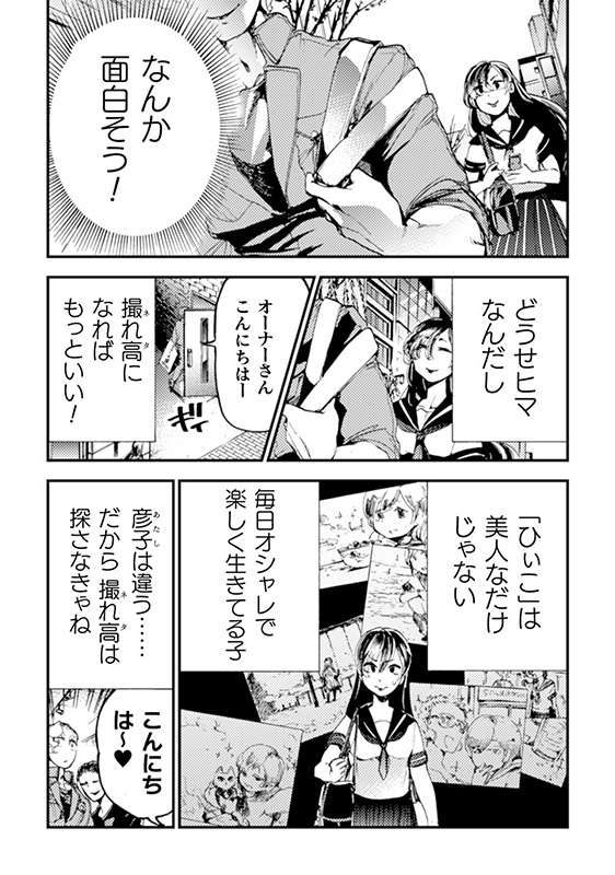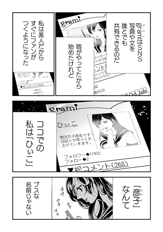SNSで飾った自分を見せることで 自分の世界に生きている「ひぃこ」 そんな彼女は毎日街中でSNSのネタを 拾うために彷徨っている。 ある日、大紀を見つけた彼女は 何か美味しい『ネタ』が無いかと 誘われるようにギャラリーにたどり着く。 自分が『ネタ』にされるとは思わずに……