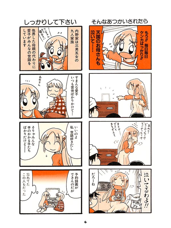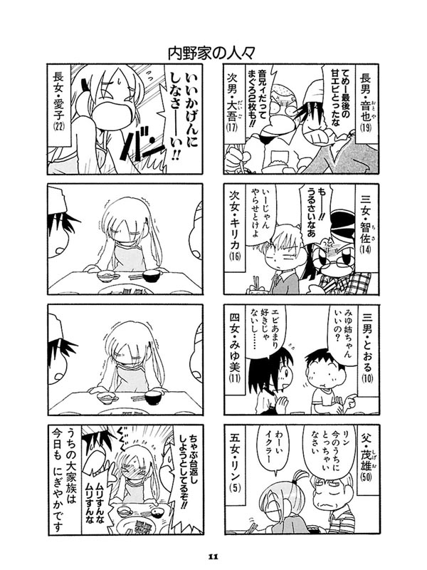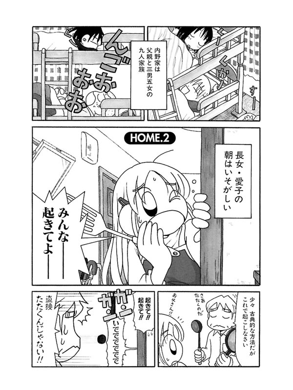 大爆笑の熱血青春ホーム4コマがついに単行本化!! 次世代の大物4コマ作家・重野なおきの入魂作! 千葉に住む内野家は、今時珍しい父親と三男五女の大家族。長女の愛子が亡き母親に代わり、家事に育児に大活躍!! 笑いの中にも温かさが溢れる、にぎやかな家庭を是非お楽しみください!!