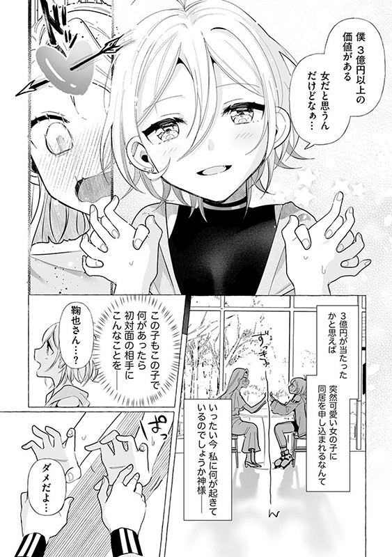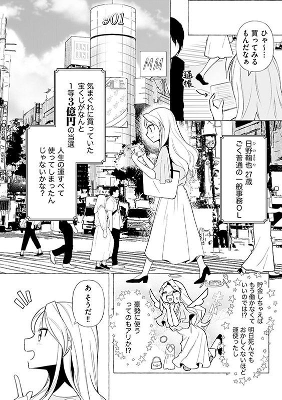 平凡なOL・日野鞠也は、ある日何気なく買った宝くじの一等が当たり、一気に大金持ちに! 3億円もの大金をどう使うか夢心地に考えていた鞠也だが、通帳をうっかり落としてしまう。 そしてその通帳を偶然拾った美少女・辻堂てんまが、返す代わりに自分を養うよう持ち掛けてきて…!?