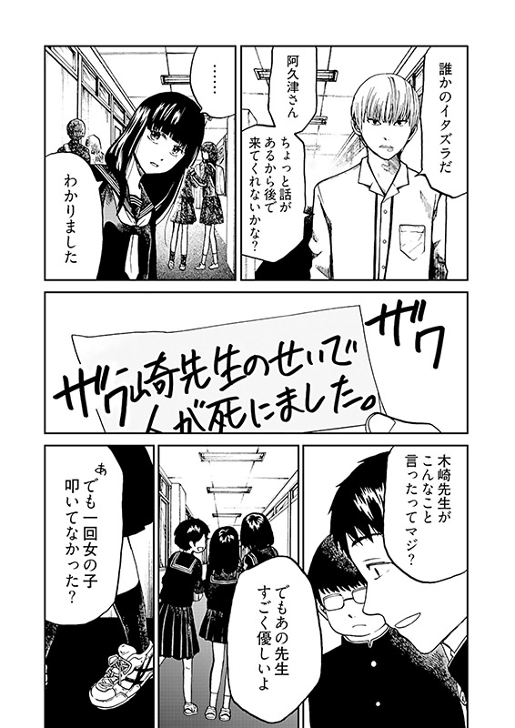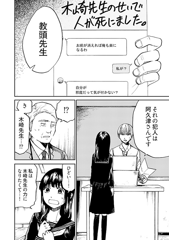 阿久津八重は美術教師の木崎にぞっこんな女子高生。毎日木崎に付きまとっていた。しかし、高校の屋上での八重の自殺未遂騒動を皮切りに八重の言動や行動が一変、木崎を脅すようになり……!?