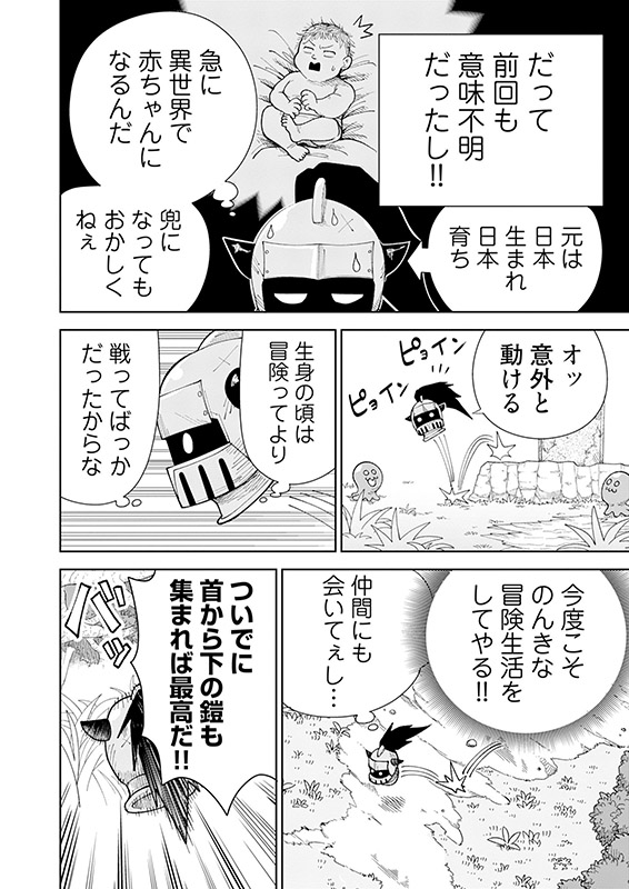 かつて魔王と相打ちになった異世界転生者、ヤマト。その功績は死後100年経っても勇者としてたたえられていた。そんなヤマトは100年後の異世界に二度目の転生を果たすが、体は昔使っていた鎧の兜になっていた!