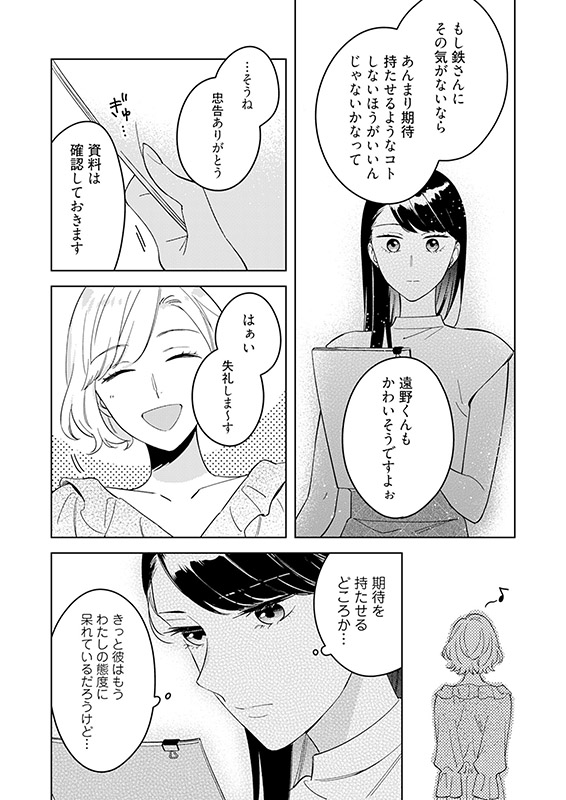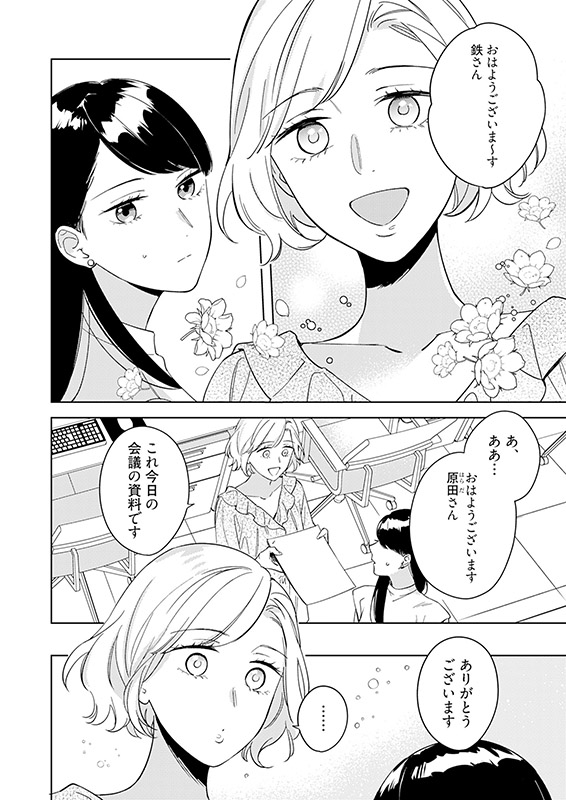 そんなある日、新しく配属されたアメリカ帰りのハイスペ×イケメンの遠野君。彼は、「厳しい」「何を考えているかわからない」と密かに「てっしんさん」と呼ばれている鉄さんに興味津々。遠巻きにする周囲をよそにぐいぐい距離を詰めていく。思いもよらない彼の行動に、鉄さんのペースは乱されっぱなし!?【恋するソワレ】この作品は「恋するソワレ」2022年Vol.1に収録されています。