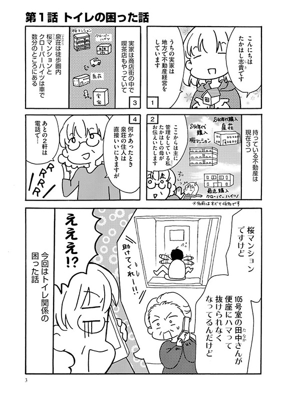 地方で3つの不動産を持つ大家さんの、不動産経営のリアルと、ちょっとワケありな住人たちとの関わりを描いたコミックエッセイ。