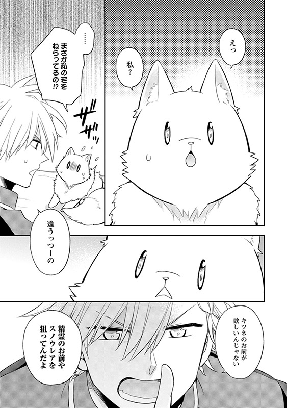 前世日本人、転生したら雪の精霊の子ギツネに!? そんな前世の記憶を持つミルは、強面で屈強な騎士たちばかりがいる砦に迷い込んでしまうも、彼らと次第に仲良くなり楽しい日々を過ごしていた。