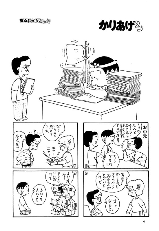 万年ヒラ社員でイタズラの天才、かりあげクン。初登場の時から、独特のヘアスタイルは変わっていません。