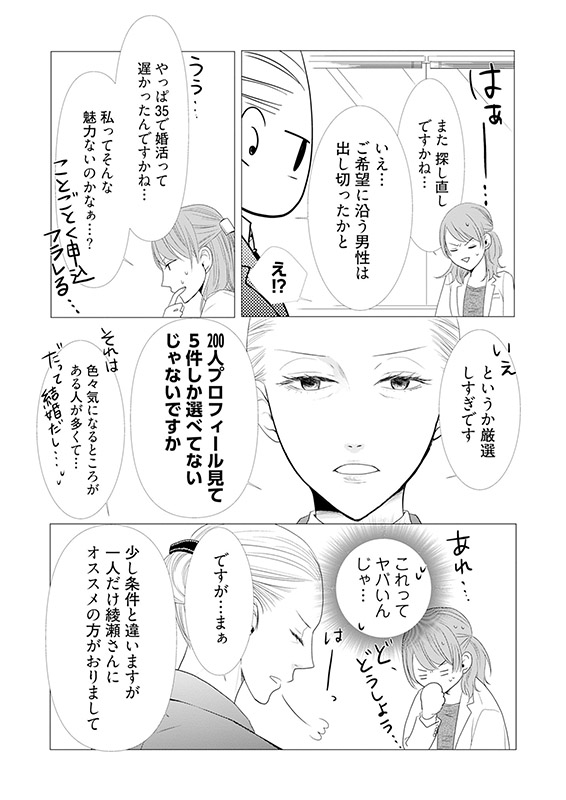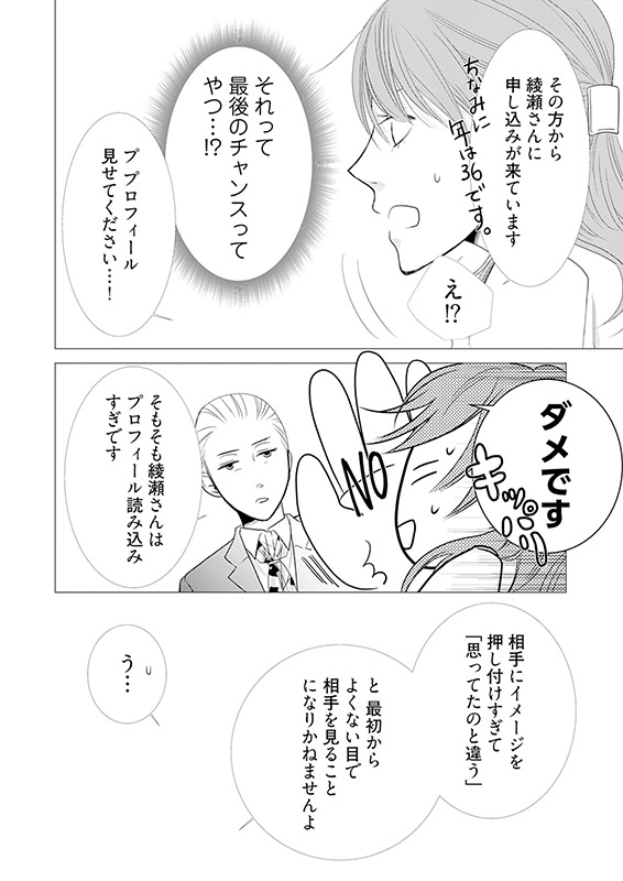 仕事にかまけ、35歳でようやく婚活始めた美智香の前に現れたのは、大企業の課長で、人当たりも柔らかい、気の利く1歳上のイケメン・鵜森(うのもり)さん。「コレはなにかある!」そう踏んであれこれ質問を繰り返す美智香だが、欠点らしい欠点が見つからない。