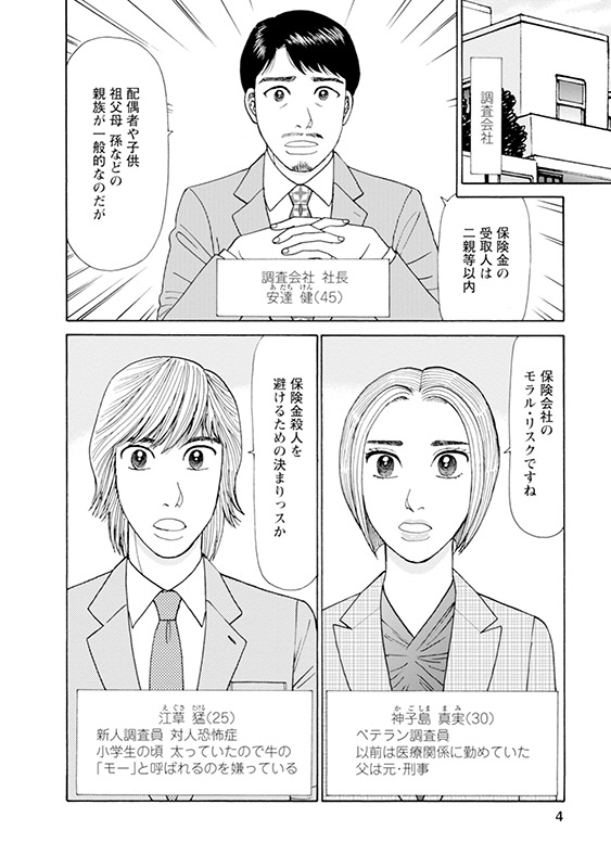 切れ味するどい調査が持ち味・神子島真実と、ドン臭いけど情味豊かな江草猛のコンビが贈るハートフルなミステリー。今回の保険調査は!?