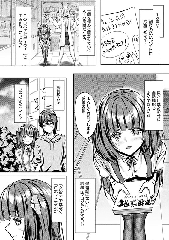 アンドロイドと一緒に生活して人間性を学ばせるという高額バイトに応募した男子学生。紹介されたディヴィーと名付けられた少女型ロボットから「保護者様」と呼ばれながら、一緒に散歩をしたり料理をしたりと何気ない日常を過ごす青年は、好奇心旺盛で日々学習していくディヴィーの愛らしい笑顔に惹かれつつも、機械相手に感情移入しないように気をつけていた。ある日、珍しく虚ろな目をしていたディヴィーに声をかけた青年は、正体不明のデータにより「キス」プログラムがインストールされたディヴィーから情熱的なキスを迫られる。自らの異変に戸惑いつつも続きを望む美少女アンドロイドは、「手コキ」「騎乗位」とインストールされていくスキルを使い人間を気持ちのよい射精へと導いていく……。