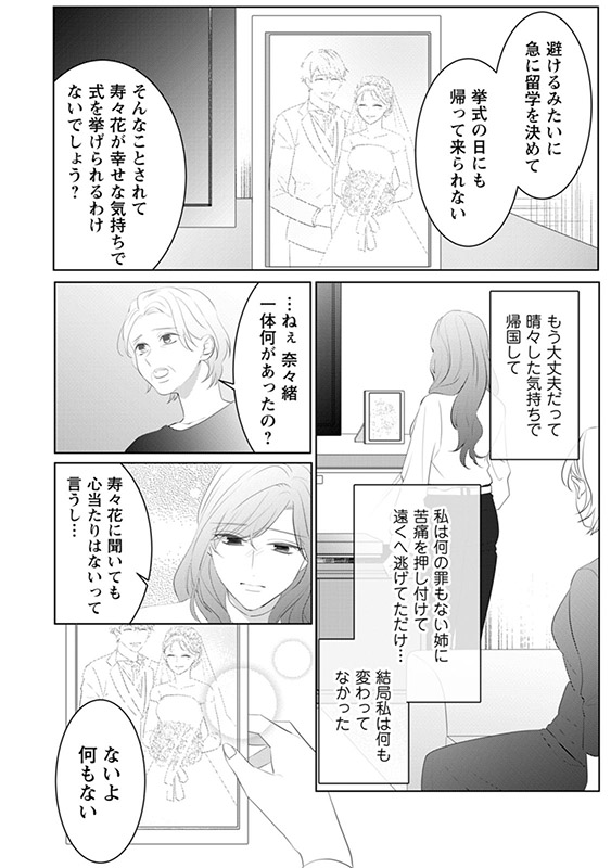 アメリカから帰国し、8年ぶりに姉と会うことになった奈々緒。8年の時を感じさせないくらい楽しい時間をすごしていたはずだったが「奈々緒は私の事をずっと…避けてたよね?」と聞かれてしまう。