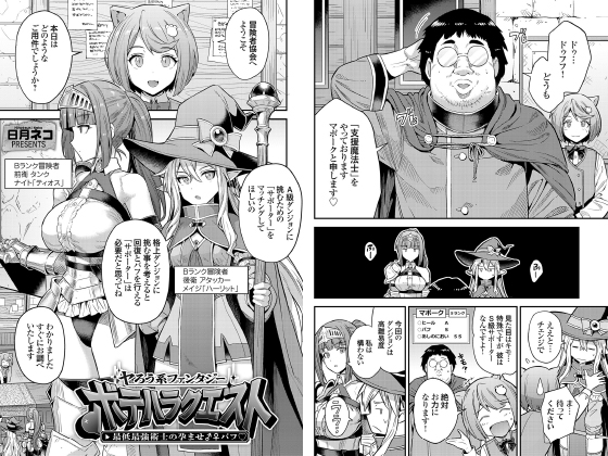 ここは冒険者たちが魔物に立ち向かうためのマッチングを行う冒険者協会。そこにBランクメイジのハーリットとナイトのティオスが訪れる。Aランクのダンジョンに挑むため優秀なサポーターを募集すると紹介されたのはまさかのキモオタで…!?「チェンジで…」ブヒブヒ言うキモオタと組めるわけがないと即キャンセルを申し出るハーリットだがキモオタはまさかのSランク。高難易度ダンジョンに挑むためなら仕方ない…と受け入れてダンジョンへ向かう。高難易度ダンジョンの敵は手強く、キモオタにバフの援護を頼むと、そいつがいきなり男性器を扱き出す。彼の能力はスキル「早漏」で迅速にマスターロッドから特濃ポーションを出すものだった!!キモさに絶叫するハーリットをよそに、ぶっかけられ精子まみれになったティオスは手強かった敵を一撃で切り刻み、バフの効果を実感する。そこにこのダンジョンのボス・サイクロプスが現れ再びピンチに!果たしてはハーリットは素直にキモバフを受け入れるのか!?