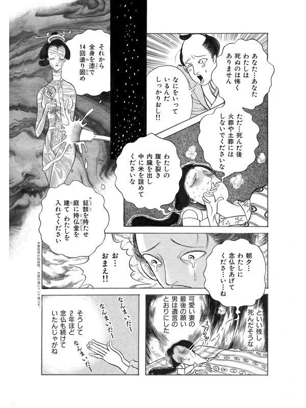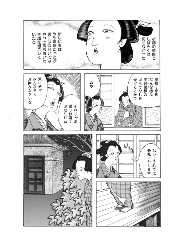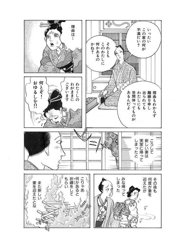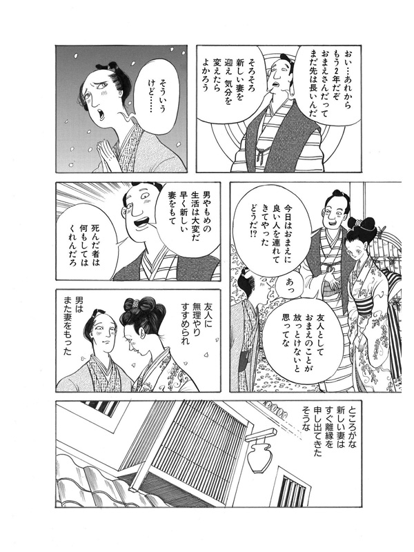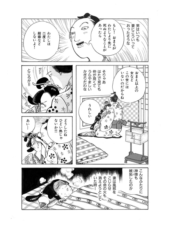 この世には数多の話があり、長く生きた婆が語るのは恐ろしくも怪しい、血塗られた古の怪談話である。むかしむかし、男は妻にいつもこういっていたそうな。「もし、お前がわたしより先に死ぬようなことがあったら、わたしは二度と結婚などしない!」そんな誓いを立てた矢先、突然妻が不治の病におかされてしまう。そして、その命の火も消えようとしていた時…妻は夫にあるお願いをするのだった……。(年増女のおしゃべりに嫉妬深い女の執念を描いた第一話より)